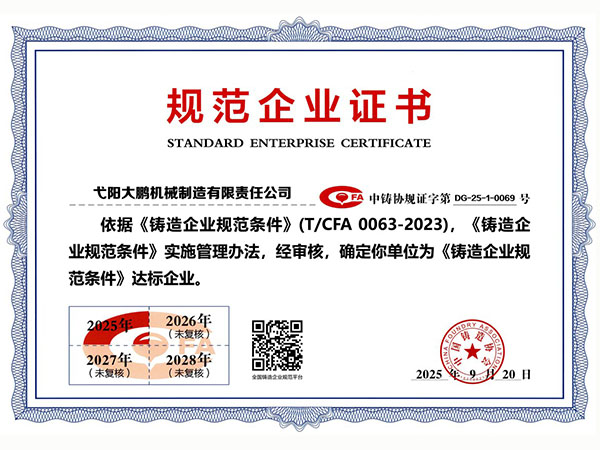 公司順利通過質(zhì)量管理體系認(rèn)證、環(huán)境體系認(rèn)證、職業(yè)健康安全管理體系認(rèn)證、環(huán)評(píng)。2015年5月獲國(guó)家工信委頒發(fā)的《鑄造企業(yè)準(zhǔn)入條件》;2019年做了安全現(xiàn)狀評(píng)價(jià);2020年取得了排污許可證。